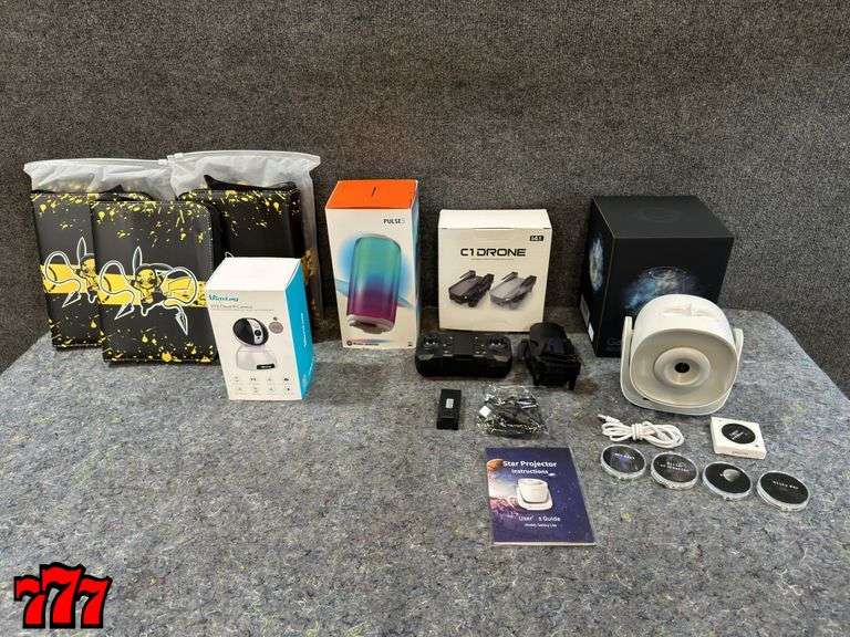 LOT 845 - 5 New Unused Pokémon Card Binders, 1 Vimtag Cloud IP Camera, 1 Pulse5 Bluetooth Speaker, 1 C1 Drone & 1 Galaxy Projector Light
