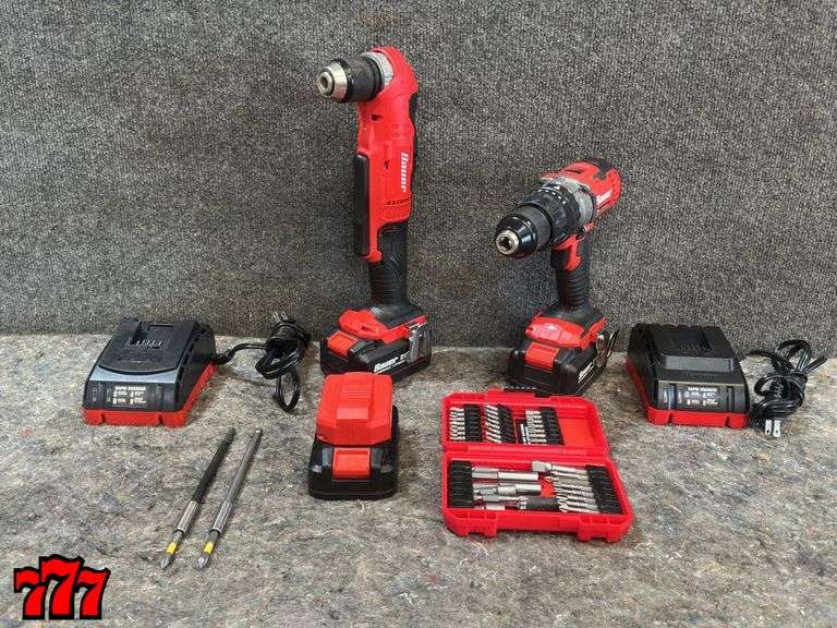 LOT 421 - 1 Bauer Right Angle Drill, (1) 1/2” Hammer Drill, 3 Batteries, 1 Charger & Bits