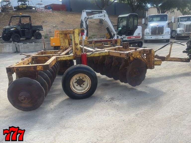 8ft wide disc gangs, 10ft corner to corner cut width, hydraulic raise and lower.