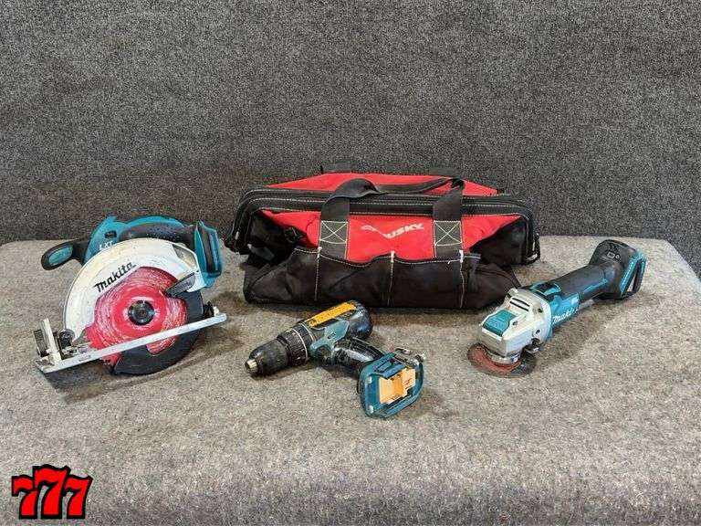 LOT 340 - 1 Makita 6-1/2” Circular Saw, 1 Brushless 1/2” Hammer Driver Drill, (1) 5” Angle Drill & 1 Husky Tool Bag